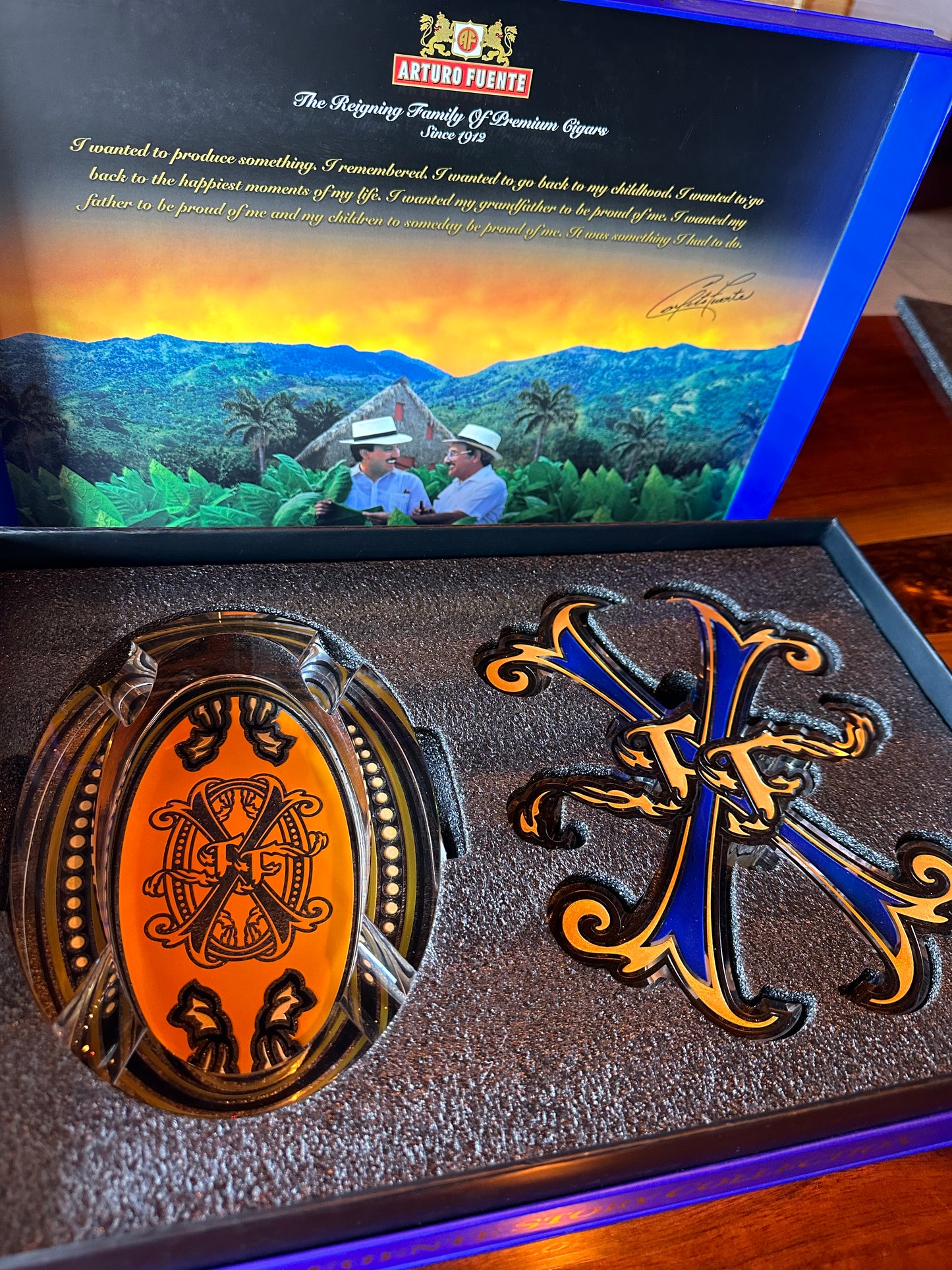 This beautiful blue Arturo Fuente OpusX Crystal, two-piece Ashtray is the perfect addition for your collection. Crafted with exquisite opulence, its stunning crystalline design will make it the envy of all who lay eyes on it. Make a sophisticated statement with this luxurious and exclusive ashtray.